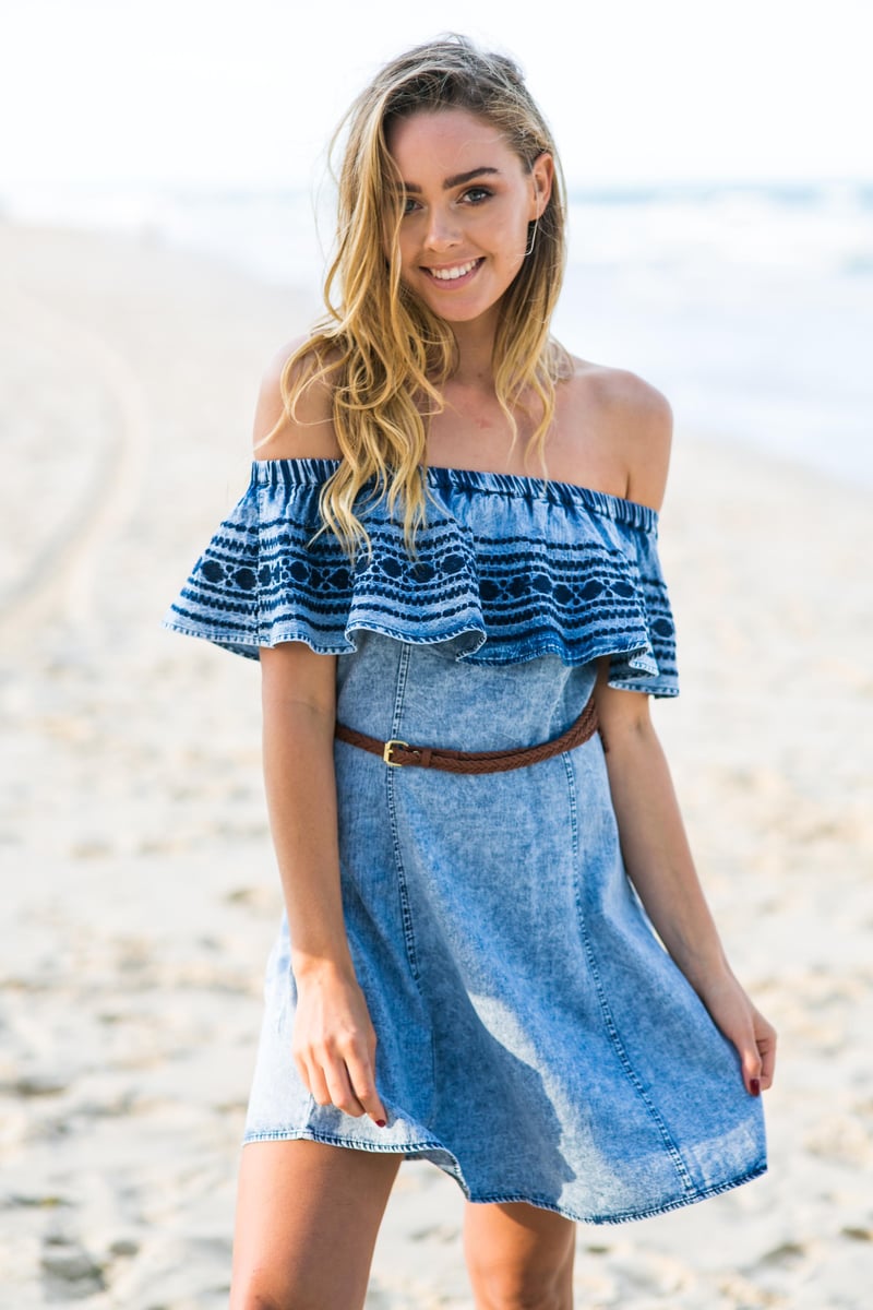 Try something new with this Lust frilled off shoulder neck denim dress. This off-shoulder style is the perfect pick for a night out, or even a casual weekend trip to your favorite coffee shop.